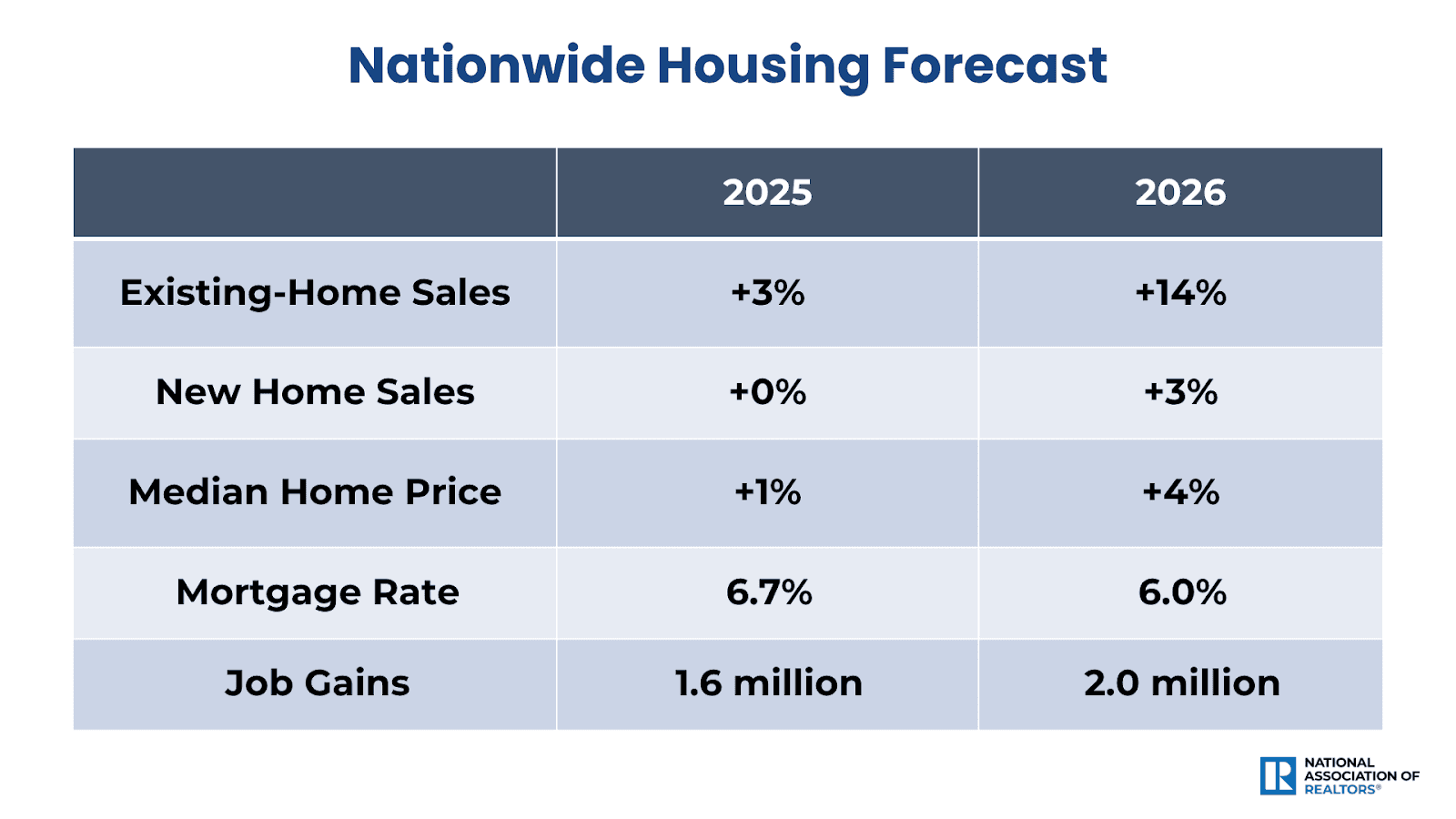 NAR’s market forecast expects a housing comeback as mortgage rates settle lower and job growth strengthens. Lower rates may spark more buyer activity, but without enough inventory, affordability will remain strained. Even NAR acknowledges that the recovery will be uneven. Lower rates alone cannot overcome a decade long supply deficit.